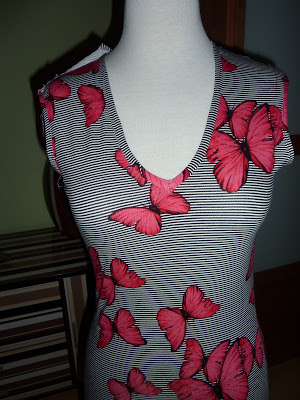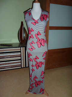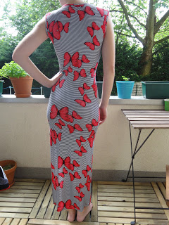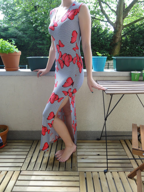 Ich kam…sah und musste den Stoff kaufen und natürlich wie immer ganz ohne Plan; ein Jersey schwarz-weiß geringelt und mit pinkfarbenen Schmetterlingen bedruckt. Zu Hause angekommen, gleich mit Mausi kommuniziert und via Skype meine Frage: Was willst Du daraus haben? „Ein enges Kleid-lang-ganz lang…“