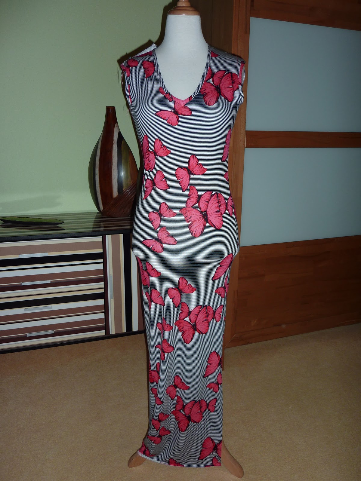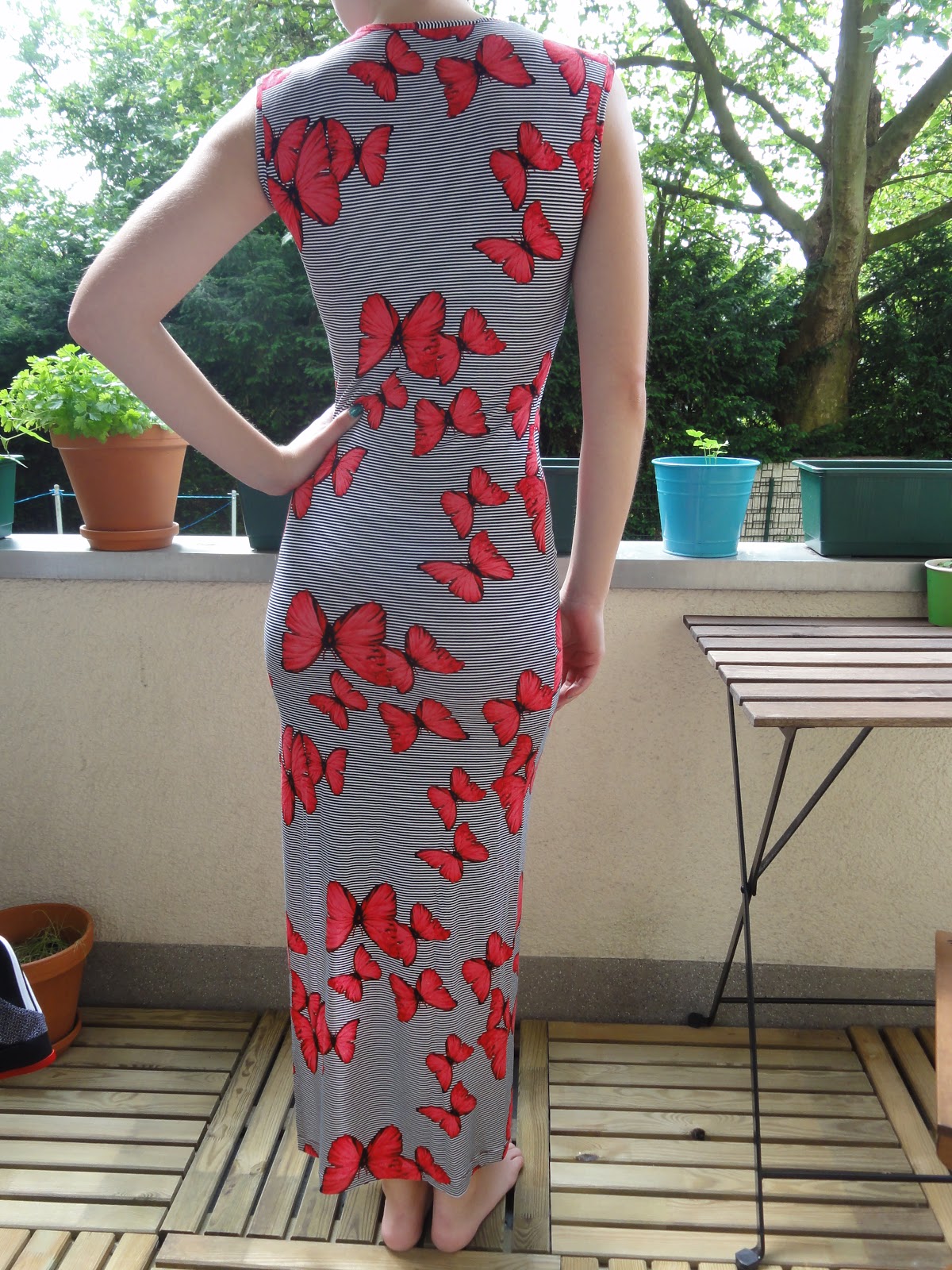 Ich kam…sah und musste den Stoff kaufen und natürlich wie immer ganz ohne Plan; ein Jersey schwarz-weiß geringelt und mit pinkfarbenen Schmetterlingen bedruckt. Zu Hause angekommen, gleich mit Mausi kommuniziert und via Skype meine Frage: Was willst Du daraus haben? „Ein enges Kleid-lang-ganz lang…“