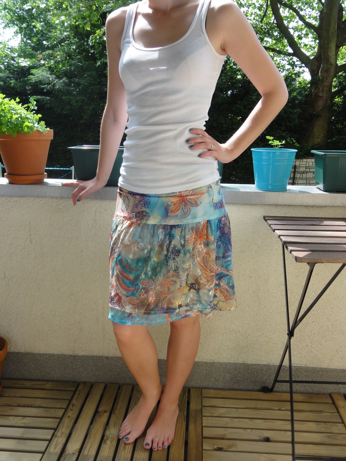 Bei diesem Modell habe ich den eigentlichen Schnitt etwas abgewandelt. In Grundzügen wurde der Schnitt aus burda style 05/2012 Modell 111 verwendet. Ich habe jedoch das oberste Teil schmaler zugeschnitten, damit es eng anliegt und ich habe auf die 3. Stufe verzichtet, damit der Rock insgesamt kurz ist.