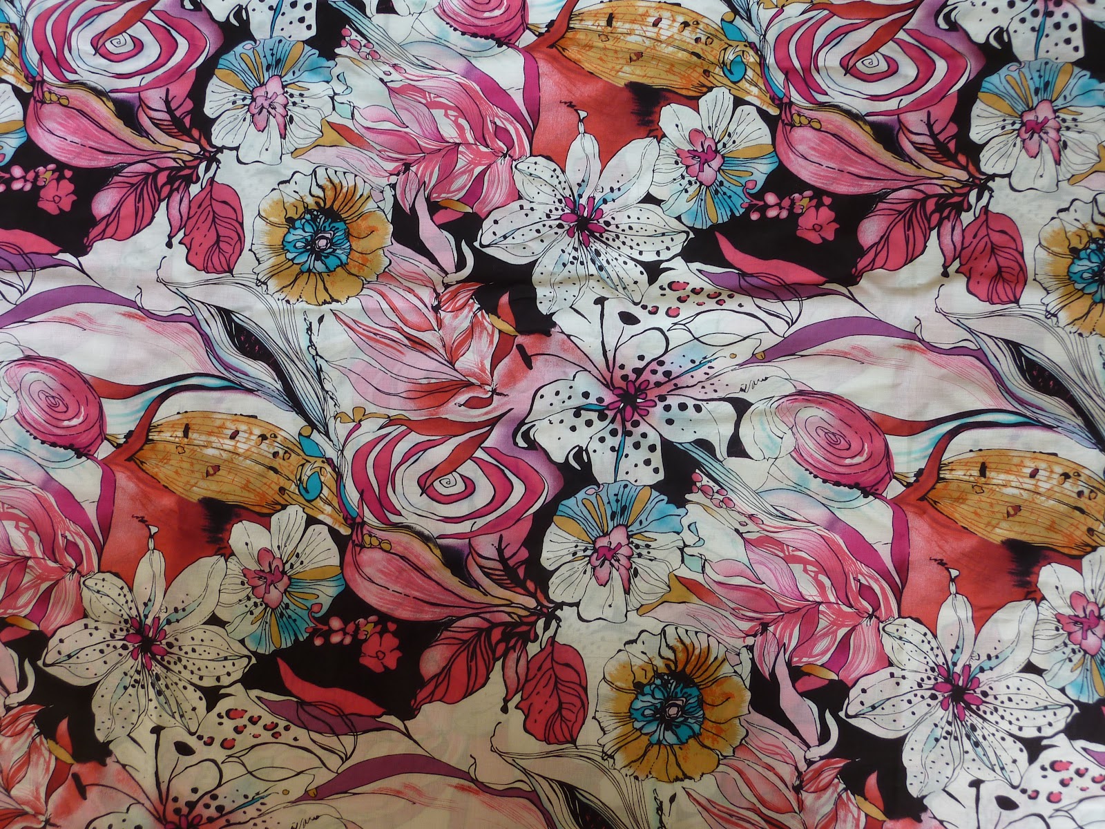 Faszinierend an den Stoffen ist das Material. So besteht die oberste Stufe aus Jersey und die beiden Weiteren aus einem Polyester/Viskose/Gemisch…und beide Stoffe haben den gleichen Druck…einfach toll.
