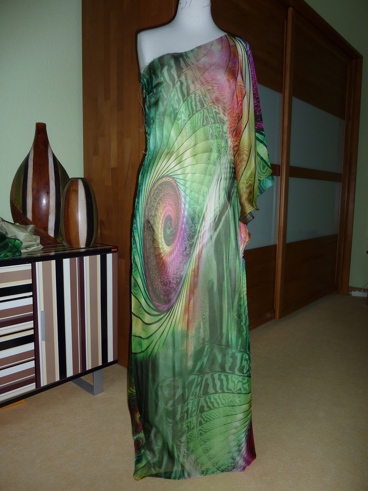 Meine „verrückte“ Tochter vertraute mir doch tatsächlich italienische Seide an. Unter Berücksichtigung der bescheidenen finanziellen Verhältnisse einer Studentin und meiner kleinen Nähkenntnisse – ein waghalsiges Unterfangen. All meine Überredungskünste waren vergeblich; sie musste diesen atemberaubend schönen Hauch von nahezu Nichts kaufen…und ich konnte sie dann verstehen.