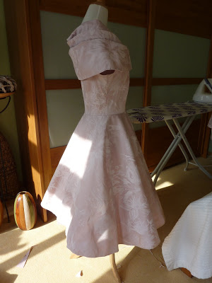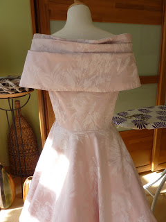 „auseinandergenommen“ auf dem Boden. Auch Carolins Kleid war dabei keine Ausnahme. Insgesamt betrachtet, war ihr Kleid allerdings am schnellsten fertig. Es passte gleich bei der ersten Probe fast perfekt und vorallem auch zu ihrem Typ. Zudem konnte ich auch noch etwas Neues erlernen: „Rollieren“. Die Saumkante des üppigen Kragens musste rolliert werden.