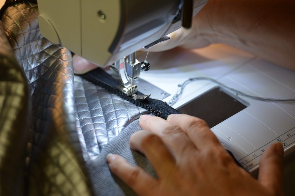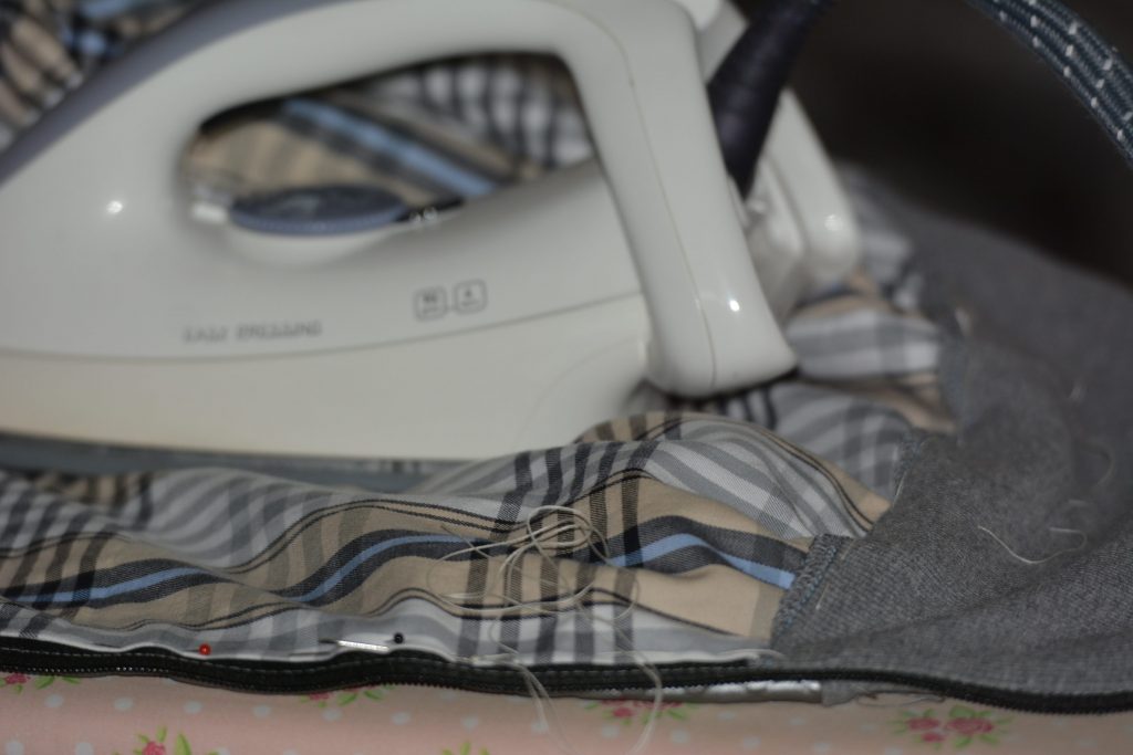 Vermutlich weil das Material stumpf ist, hatte ich keine Probleme. Auf der linken Seite ist das Material auch stumpf. Eine beschichtetes Polyester, vermute ich zumindest. Ich dachte anfangs auch, dass es ggf bauschig werden könnte, bin daher auch überrascht, dass es sich am Körper an schmiegt. Auch das sich die Bündchenware so gut eignet, hat mich gefreut. Ich hatte mir extra breiten Gummi besorgt, falls sich die Jacke nicht gut einhalten lässt, also die Bündchenware zu schwach ist. Aber auch ohne Gummi konnte ich die Weite gut einhalten. Ich bin mit dem Ergebnis wirklich sehr zufrieden. Das ist ja nicht immer so 😉