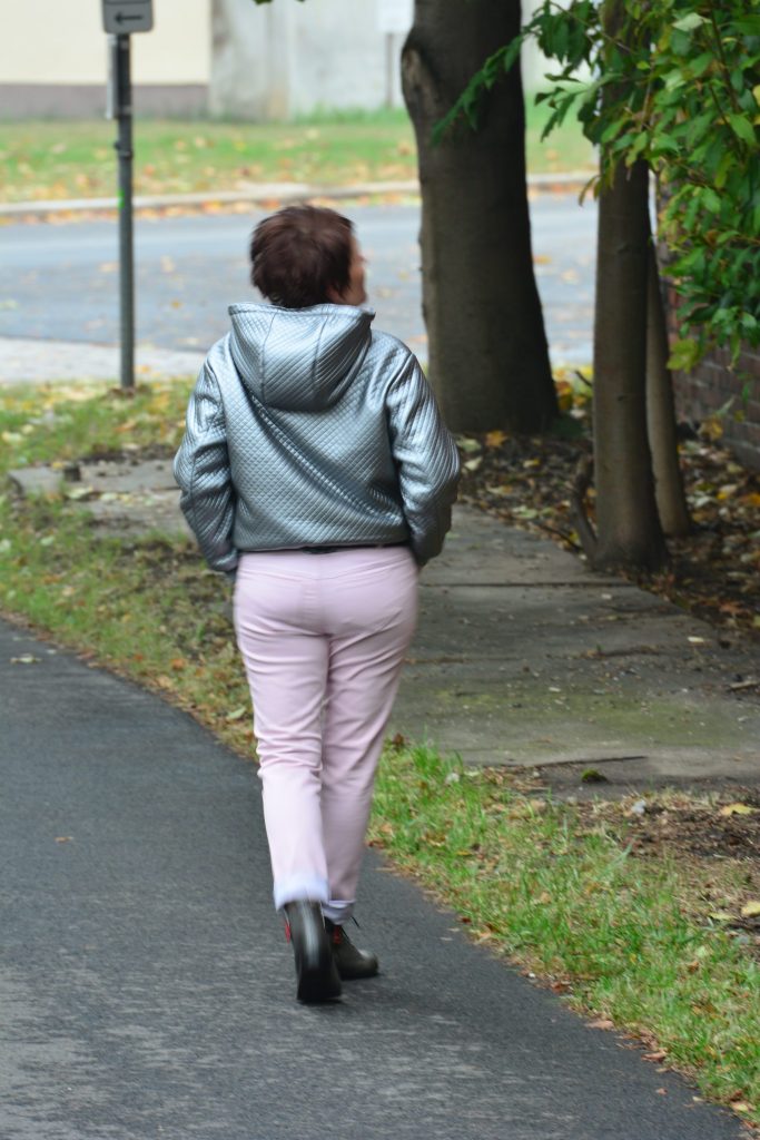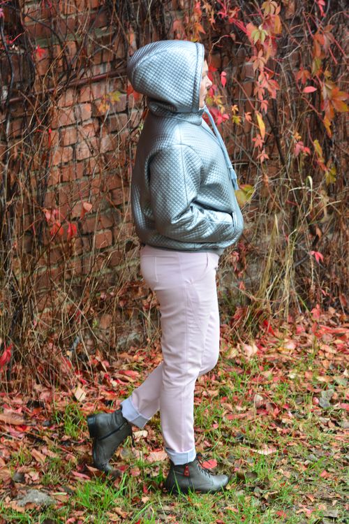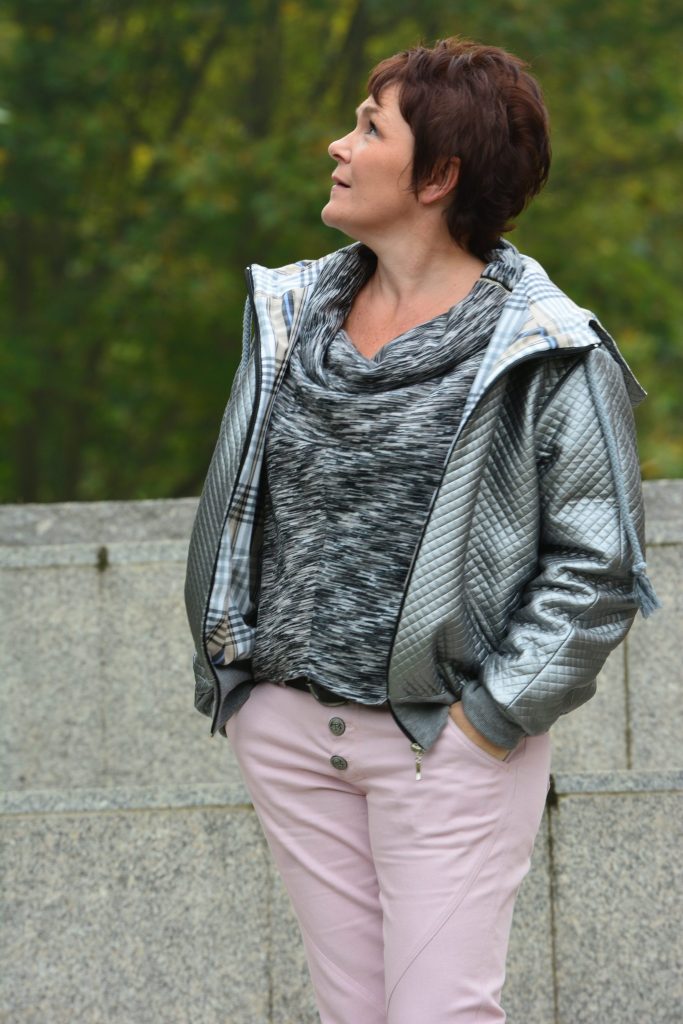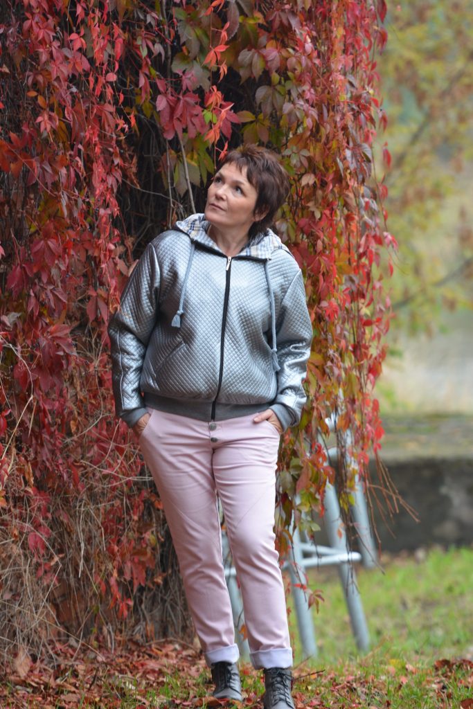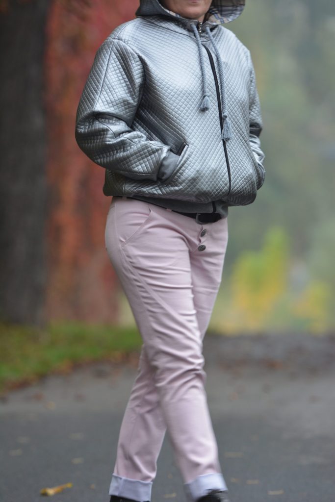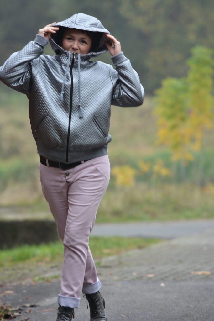 Das Material nähte sich total unkompliziert und überraschenderweise konnte ich es sogar von Links mit Tuch bügeln. Für das Futter wählte ich eine angerauhte Baumwolle. Ich hoffe damit die Trageeigenschaften erheblich zu erhöhen. Beim heutigen Fotoshooting war mein Blouson wirklich ein super angenehmes Kleidungsstück. Morgen führe ich ihn dann zum ersten Mal über einen ganzen Tag aus, d.h. beginnend auf dem zugigen Bahnsteig um dann auf mein Rad umzusteigen. Die Kapuze bringt mir hoffentlich genau den Vorteil, dass ich nicht wie „vom Winde verweht“ im Büro lande. Wenn ich dann nach einem langem Arbeitstag gut gestylt zu Hause ankomme, wird mein Blouson vermutlich erst durch meine Winterjacken abgelöst.