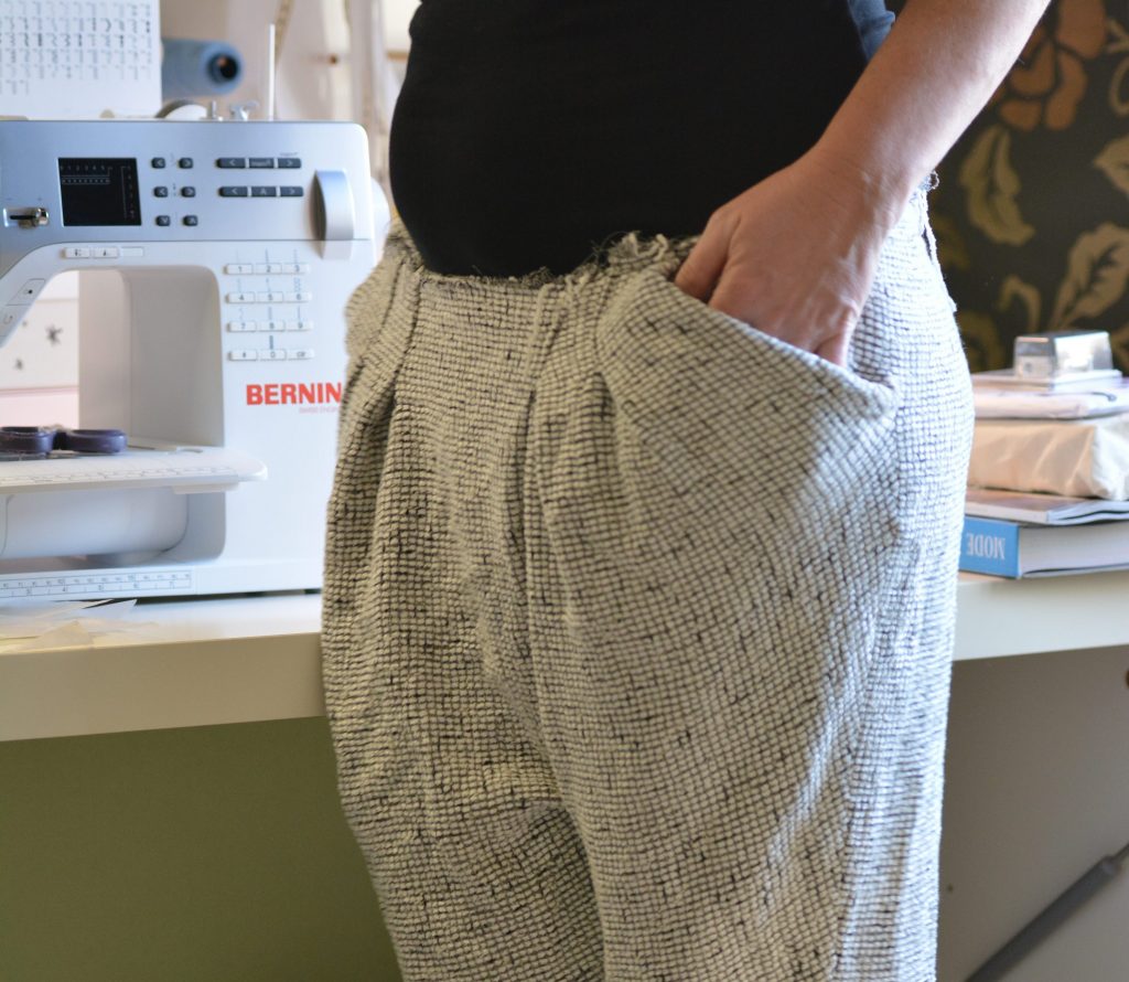Die Beschreibung zum Nähen der Taschen ist ziemlich fragwürdig. Ich habe diese daher nach Gefühl genäht bzw. gelegt. Definitiv sind die Hosenbeine im unteren Bereich zu weit. Ich habe sie schon bei der ersten Probe (noch vor Weihnachten) mit Nadeln abgesteckt, auch um meine damalige bereits vorhandene Skepsis zu relativieren. Ich bin mir auch nicht sicher, ob mir die nicht vorhandene vordere Mitte gefällt. Ungern möchte ich auch nicht runder aussehen, als ich ohnehin schon bin.