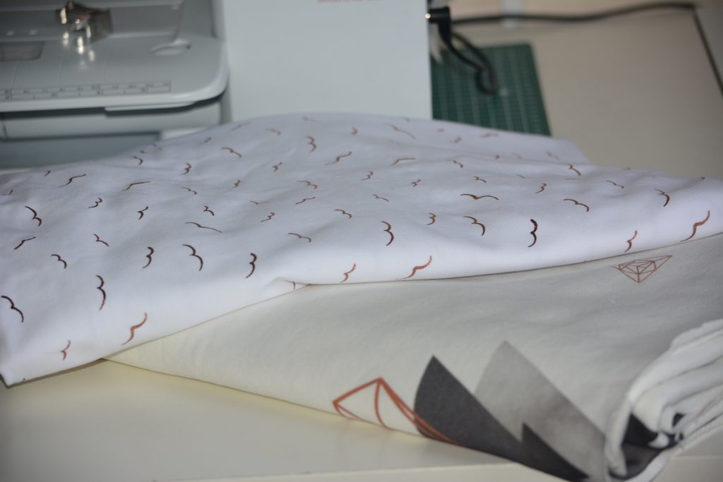 Fündig wurde ich bei Snaply. Ich fand Schrägband, welches nicht nur im Shop dem Farbton im Stoff nahe kam, sondern auch in echt noch perfekt passte und wählt die Cuve me Bündchen in ecru aus. Als dann alle Zutaten beisammen lagen, entwickelte sich ganz langsam ein wenig kreative Sympathie – zwischen mir und dem gewählten Stoff.
