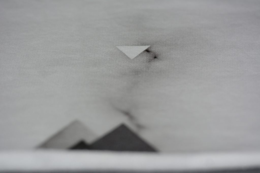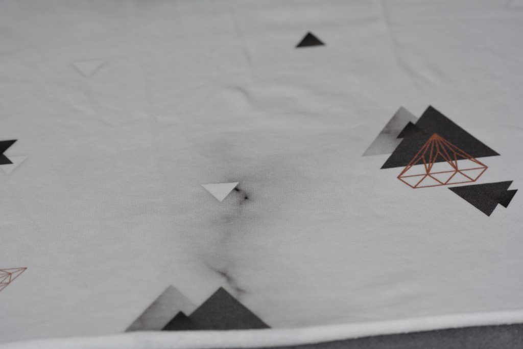 Leider wurde dieser Sweat nur anhand von Designbeispielen vermarktet und ich habe den Designbeispielen vertraut. Ich hatte damit keinen strahlend weißen Sweat, sondern einen eher ecru farbenen Stoff gekauft. Entsprechend irritiert schaute ich auf den liebevoll verpackten Einkauf, welcher noch eine Überraschung parat hielt. Der Sweat ist laut Beschreibung „marmoriert“. Was darunter in „echt“ zu verstehen ist, schaut euch bitte auf den Bildern an. Anfangs, als ich den Stoff so ganz langsam auseinander legte, war ich überzeugt, dass der Stoff fehlerhaft ist. Als dann die Stellen regelmäßig auftraten, war mir klar, das es so gewollt war.