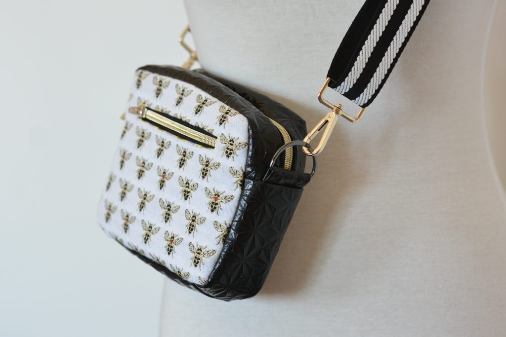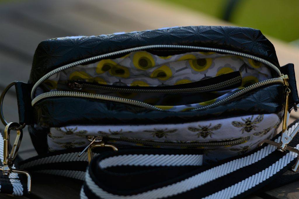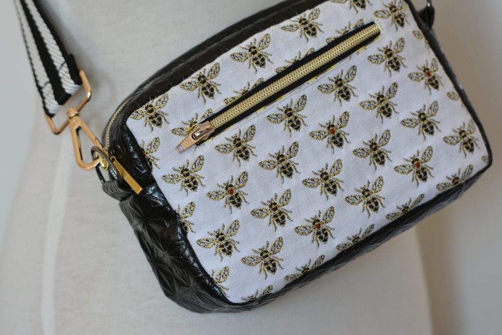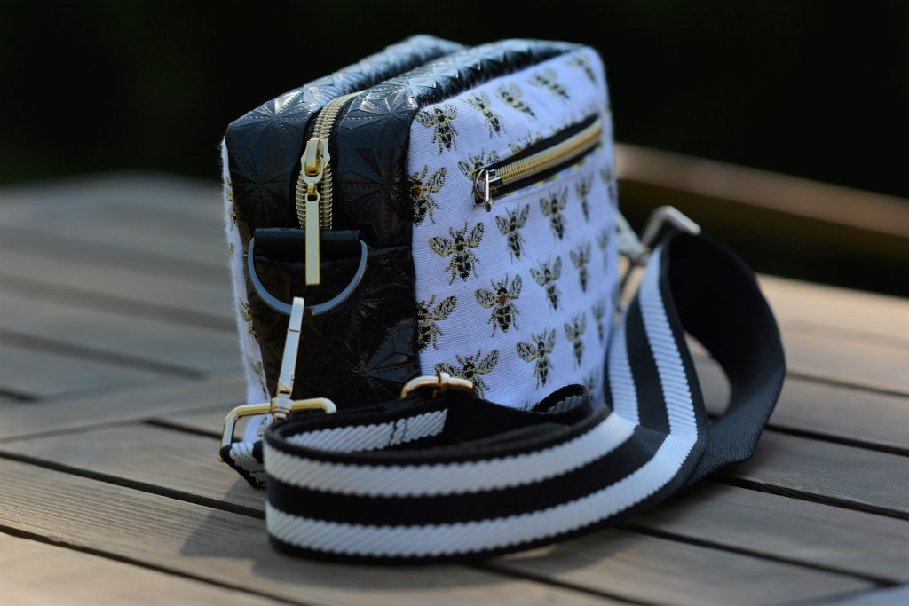 Den „Honey“ -Stoff habe ich zufällig und ganz ungeplant im örtlichen Stoffgeschäft gekauft. Nur Tage später war vom großen Ballen nichts mehr zu sehen. Was war ich froh, dass ich mir ein paar reichliche Zentimeter gesichert hatte ohne konkret zu wissen, was ich daraus nähen werde. Mit Erscheinen der crass coolen Gurtbänder bei Wunderpop stand mein Plan direkt fest. Eine größere Cambag Tessa war seid langem mein Wunsch, das schwarze Kunstleder hatte ich auch längst liegen und alles weitere Zubehör konnte ich schnell bei Snaply ordern.