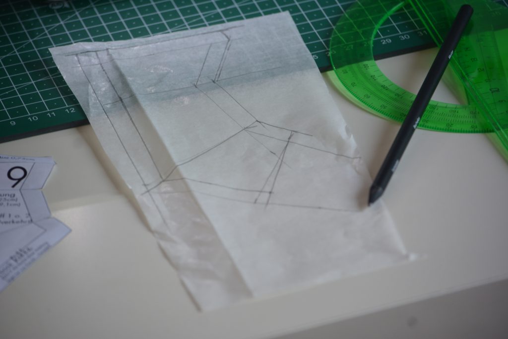 Als ich allerdings zu den Seitenteilen gelangte, wurde ich hart ausgebremst. Mein Gurtband war viel zu breit. Das Schnittmuster sieht ein 2,5 cm breites Band vor. Ich hatte mich auf dieses Band (4,0 cm) festgelegt und auch das Taschenzubehör für dieses Maß gekauft. Blieb mir nur das Schnittteil entsprechend im Verhältnis zu vergrößern. Lange her, dass ich Dreieck und Winkelmesser verwenden musste und es ist mir sogar gelungen.