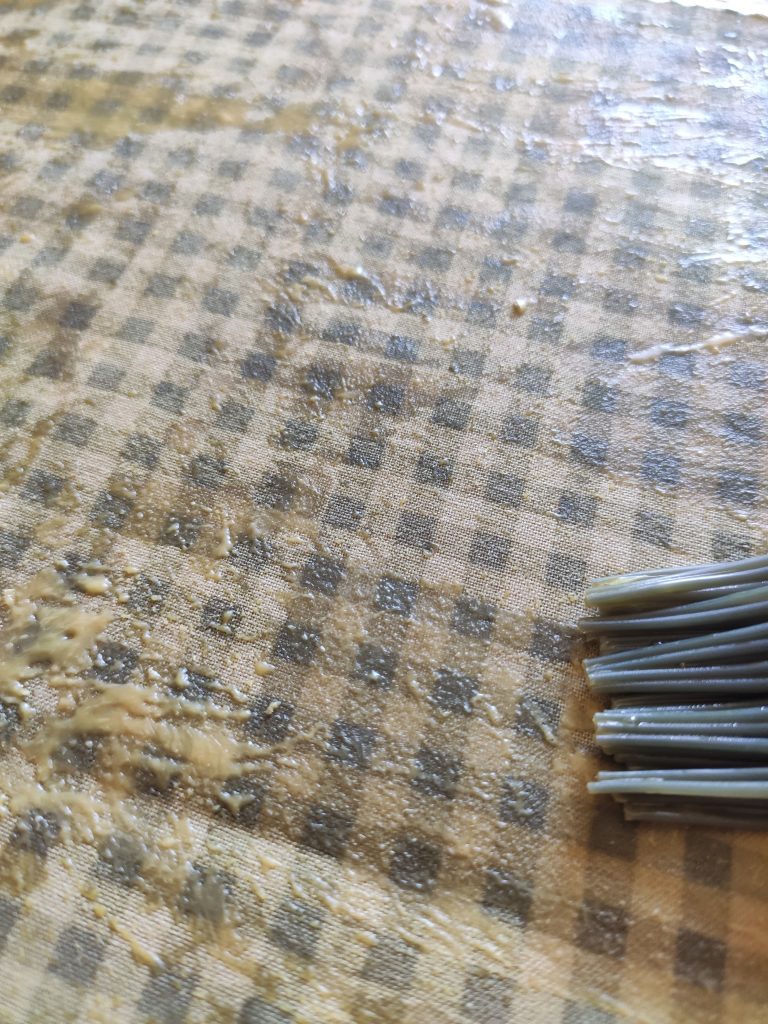 Nicht ohne nochmals alle Schritte auf Ninas Blog nachgelesen zu haben, machte ich mich dann endlich an die wirkliche Arbeit. Zwischenzeitlich wurde mir auch bewusst, warum sie so direkt über den Arbeitsaufwand und ihre Anstrengungen geschrieben hatte. Gern hätte ich auch meinen Mann das Ausdrücken des Wachses überlassen, denn das ist wirklich ein ziemlicher Kraftakt. Jedenfalls wenn man so eine große Menge Tücher produziert.