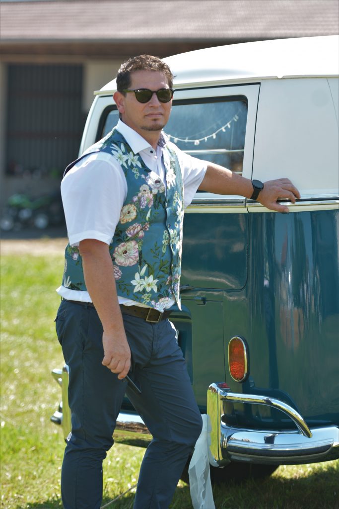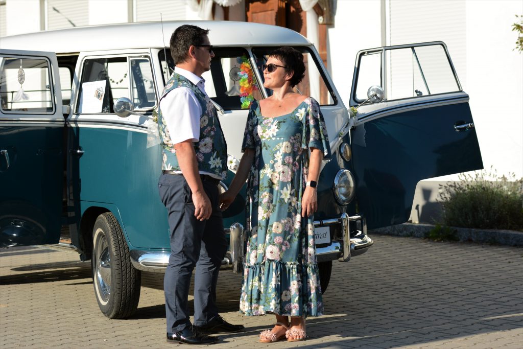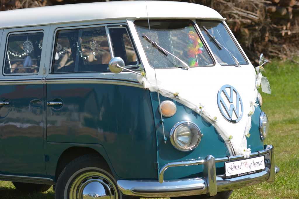 Ich wusste vorab schon von dem gewählten Brautauto und plante ihn mit Freude als Fotokulisse für uns ein. Als wir den VW Bulli dann aber in echt sahen, hätte meine Freude nicht größer sein können. Als wäre der Stoff passend zum Bulli gekauft worden 🙂 Ehrlich, es war absoluter Zufall. Ursprünglich hatte der Bräutigam ein anderes Modell ausgewählt. Dieser stand nicht mehr zur Verfügung. Es war so genial, der eigentliche i – Punkt zu unseren Outfits. Wenn ihr in der Burda zu meinem Kleid blättert, könnt ihr sogar feststellen, dass das Kleid unter dem Thema Hippi veröffentlicht wurde. Perfect match – würde ich sagen 🙂