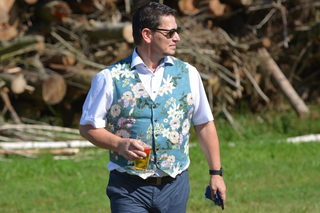 Jetzt aber zum eigentlichen Grund meines Posts – der Weste für meinen Mann. Mit der Stoffauswahl hat mich mein Mann ziemlich überrascht. Ich hätte nicht gedacht, dass er eine Weste aus einem derart blumigen Stoff tragen würde. Ich hatte den Stoff nur für ein Kleid gekauft und einen weiteren Partnerlook zur anstehenden Hochzeit gedanklich ausgeschlossen. Nach mehrmaligem Wunsch einer passenden Weste war klar, dass er es ernst meint und glücklicherweise konnte Linda den Stoff in Frankfurt nachkaufen.