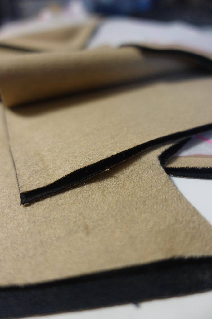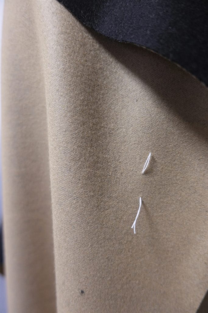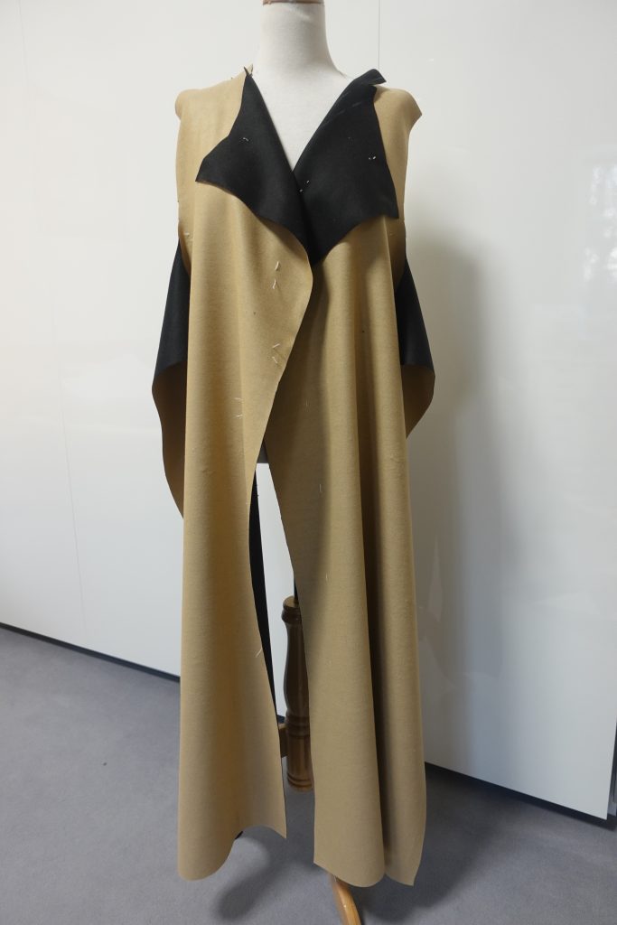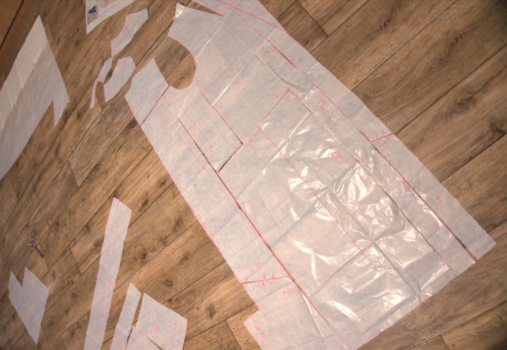 Nach dem ich dann Anfang der Woche endlich das Schnittmuster kopiert und die wirklich vielen Einzelteile ausgeschnitten hatte, dauerte es weitere Tage, bis ich mich für das Zuschneiden erwärmen konnte. Anders als beim Mantel meiner Tochter, habe ich das Schnittmuster hinsichtlich der Seitennaht nicht verändert. Das Vorderteil zieht sich also bis auf die Rückseite, im Bild unten gut zu erkennen.