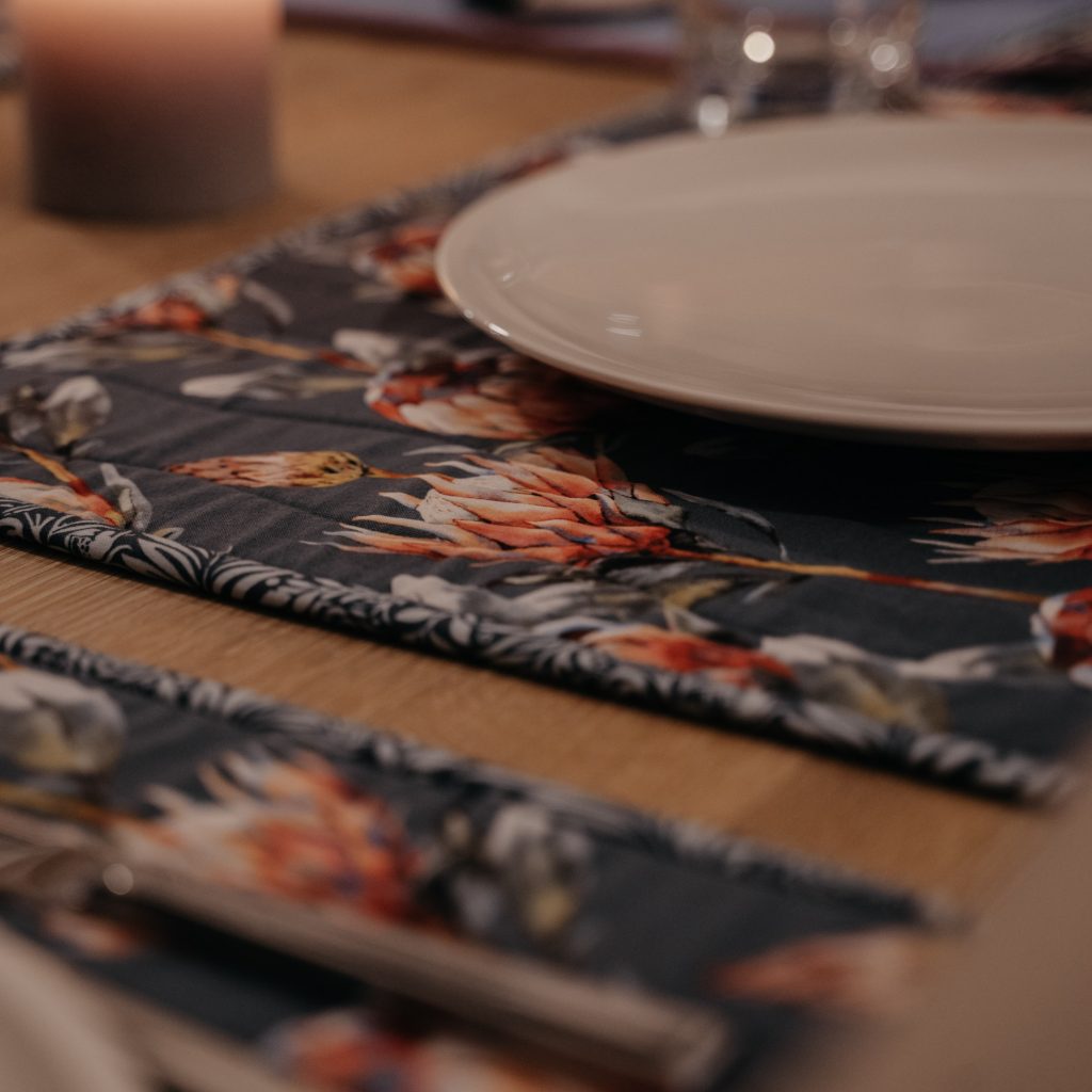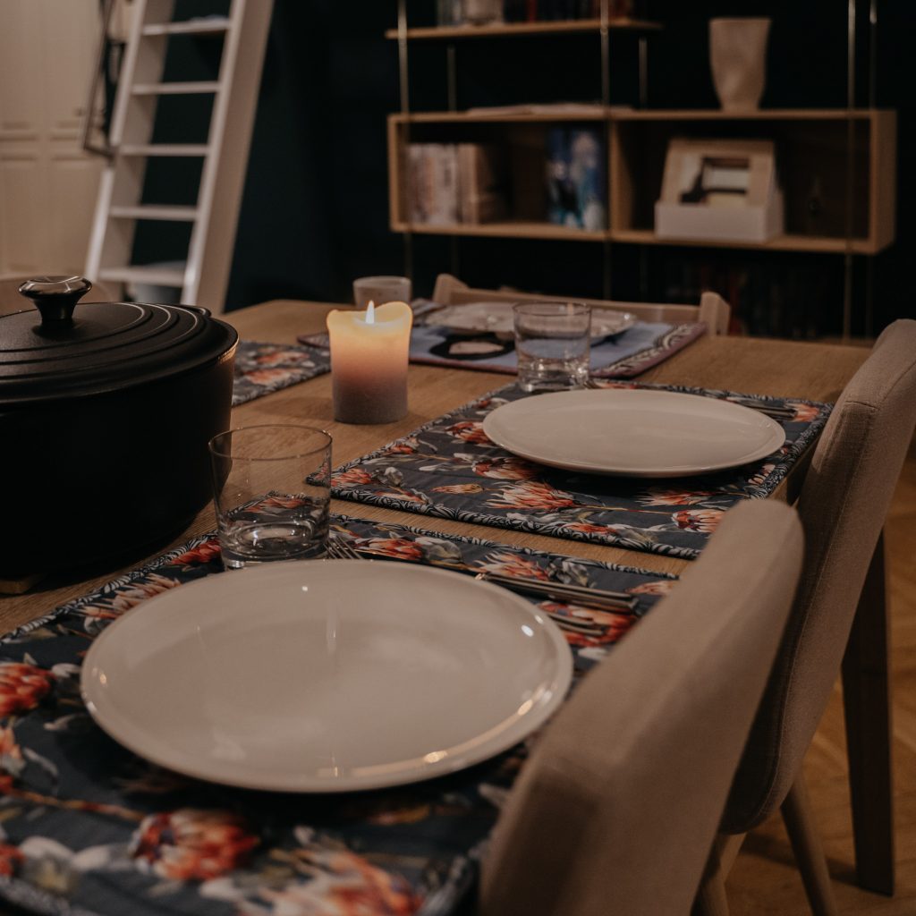 Vom Tischset Silke war ich sofort begeistert. Bei uns zu Hause sind „Platzsets“ im ständigen Gebrauch. Allerdings können sie mit Silke nicht mithalten. Die ersten Sets entstanden dann für die Familie meiner Tochter. Passend zur Wandfarbe ihrer neuen Wohnung entdeckte ich im örtlichen Lieblingsstoffgeschäft eine wunderschöne, frisch gelieferte Baumwolle. Ungefragt und daher mit einem gewissen Risiko nähte ich 6 Tischsets für den neuen Holztisch und war entsprechend gespannt auf deren Reaktion.