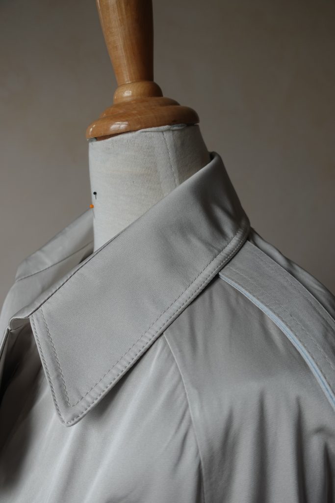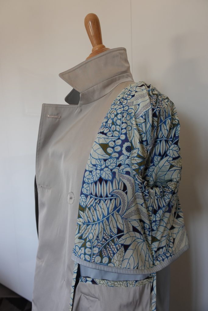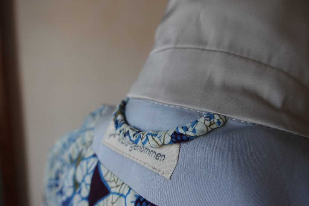 Anders als im Schnittmuster vorgesehen, habe ich meinen Trenchcoat ohne Futterstoff genäht. Nach der Empfehlung der Designerin wollte ich die Abseite des Stoffes sichtbar erhalten. Hin und wieder habe ich diese Idee verflucht. Alle Nähte mussten folglich eingefasst werden. Bisher habe ich mich immer erfolgreich um dieses schöne Detail gedrückt. Ganz ohne Futterstoff ist mein Mantel dennoch nicht genäht. So sind Vorder- und Rückenteil bis etwa handbreit unter der Brust und der halbe Ärmel abgefüttert. Als Vorlage dienten mir im Groben die Koller Teile. Das hat insgesamt ganz gut funktioniert.