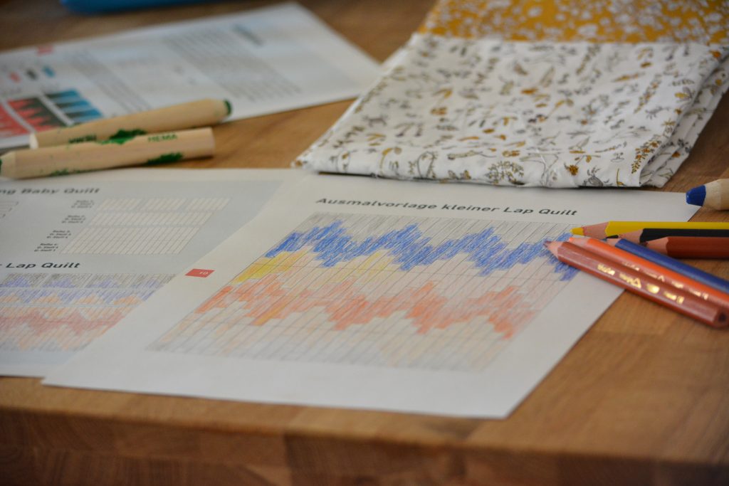 In der zweiten Woche ging es dann um den Zuschnitt. Ich bin überhaupt nicht geübt im Umgang mit dem Rollschneider und von daher war ich ziemlich aufgeregt. Dank Steffis zahlreicher Tipps im Umgang mit dem scharfe Teil bin ich ohne Verletzungen durchgekommen und habe dabei auch die Vorzüge des Rollschneiders kennen und lieben gelernt. Ganz nach Lehrmethode habe ich zunächst nur einen von 20 Blöcken zugeschnitten. Die Angst des falschen Zuschnitts war recht groß, denn auch der Umgang mit einem Quiltlineal musste erst erlernt werden. Fragt nicht wie oft ich dabei noch in Zentimeter umgerechnet habe. Steffi hatte als Planungshilfe Malvorlagen vorbereitet. Diese fanden von mir anfangs keine Beachtung. Vor dem Zuschnitt hatte ich dann doch so viel Schiss, dass ich die Anordnung der Stoffe vorsorglich zu Papier brachte.