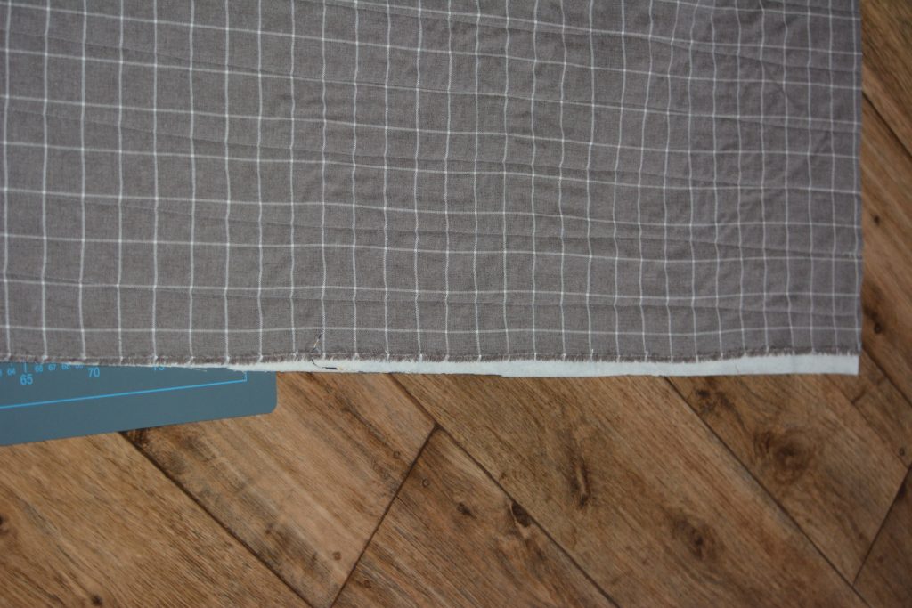Das Karo auf der Rückseite verläuft natürlich nicht gerade. Beim Quilten konzentriert man sich schließlich auf das Top. Dort sollte alles mit gleichem Abstand gesteppt werden. Natürlich habe ich die Rückseite höchst konzentriert ausgelegt, auch auf den geraden Verlauf geachtet und beim Übereinanderlegen der weiteren Lagen alle Tipps von Steffi beherzigt. Trotzdem fehlte mir, neben dem leicht schiefen Karoverlauf, an einer Seite etwas Rückseitenstoff. Am Ende nicht schlimm, denn ich habe diese Seite entsprechend schmaler geschnitten. Eigentlich hätte ich an beiden Seiten Breite wegnehmen müssen, um die Gleichheit auf dem Top zu wahren. Es fällt aber nicht auf und daher blieb es bei der einen Seite.