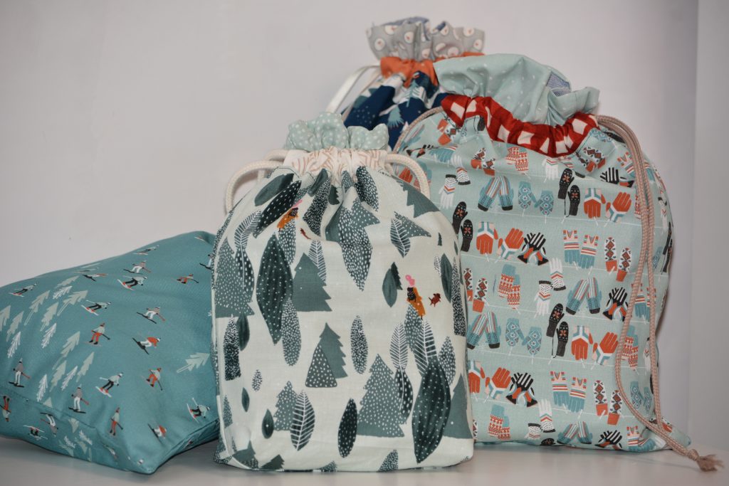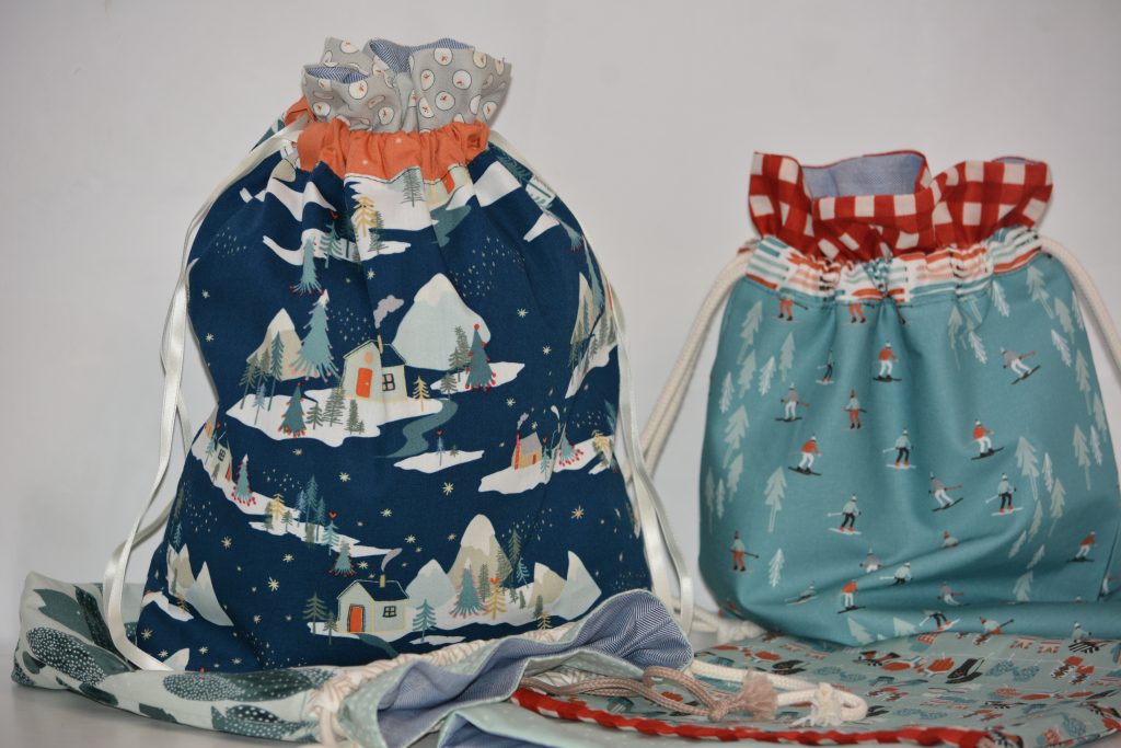 Um den Geschenken noch einen winterlich – weihnachtlichen Rahmen zu geben, nähte ich für die Schlafanzüge einen Geschenkbeutel nach dem Schnittmuster „Schnürbeutel Rudi“ von Barbara. Dieses Schnittmuster mit passenden Stoffen wurde mir zur Weihnachtszeit 2020, im Rahmen meiner Abobox vorgestellt. Damals bin ich nicht zur Umsetzung gekommen und außerdem konnte ich die wunderschönen Winterstoffe noch nicht so schnell verarbeiten.
