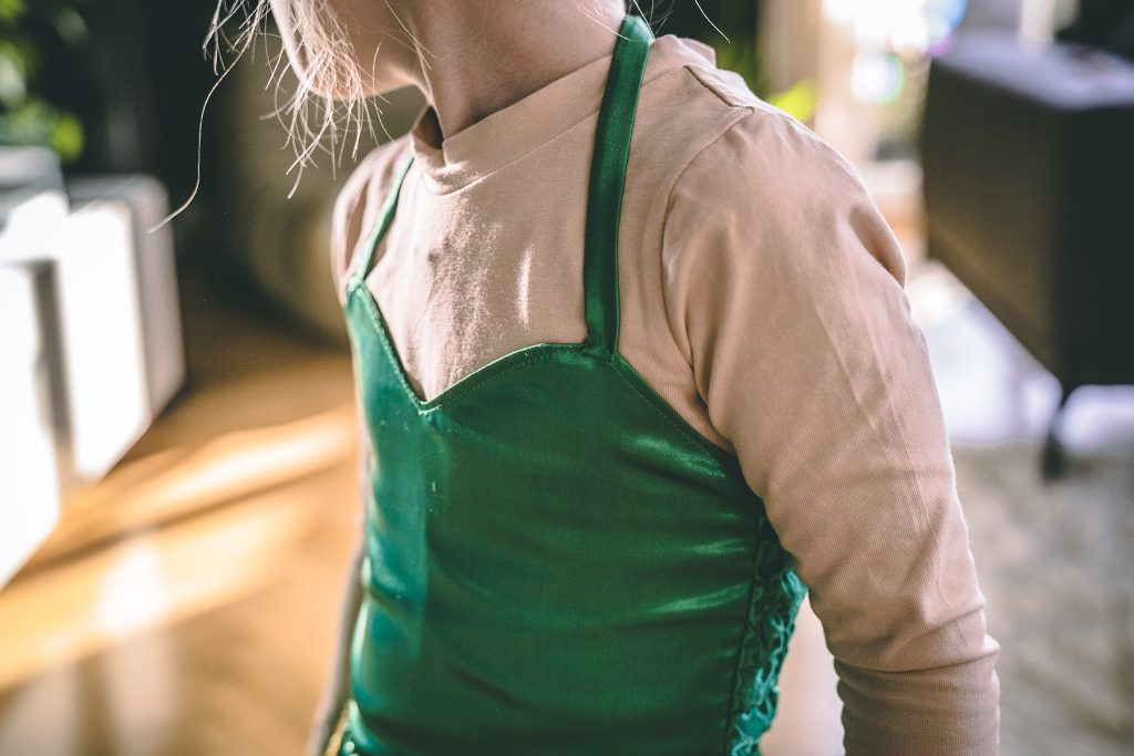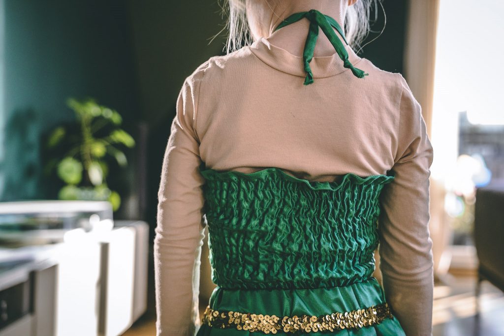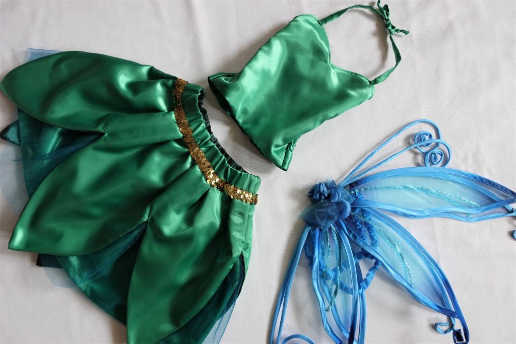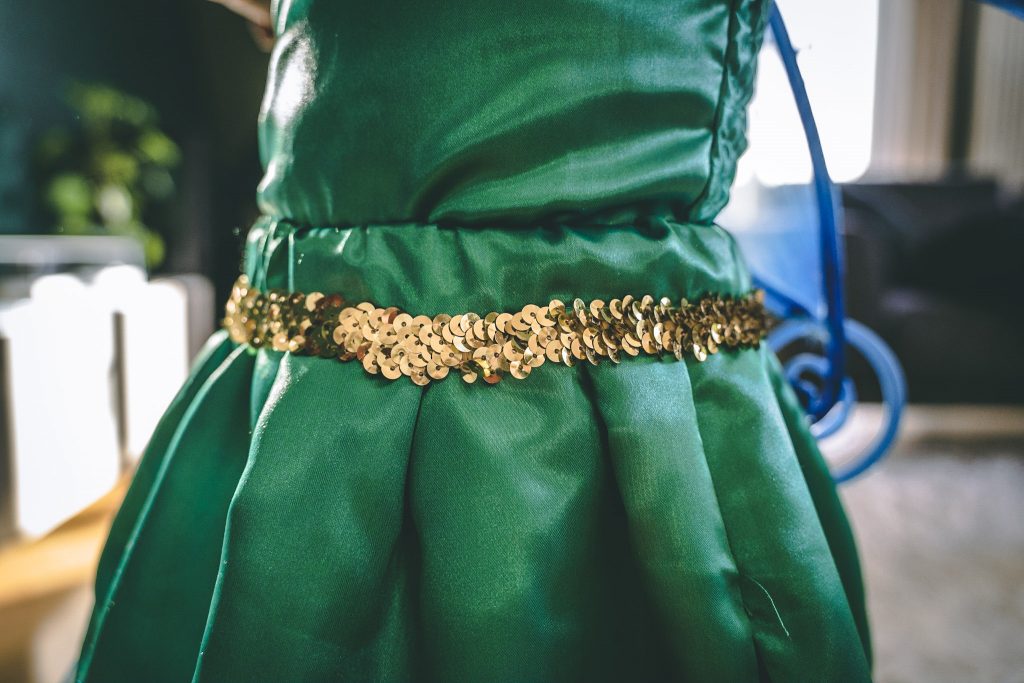 Unbedingt sollte der Rock schön voluminös werden. Dieser gute Gedanke kam mir nun an dieser Stelle. Wie schön, dass ich schon einige Kostüme genäht hatte und auch entsprechende Stoffreste vorhanden waren. So konnte ich für den Hauptrock zum doppelt Nähen einen dunkelgrünen Satin aus Resten verwenden. Dann fiel mir auch noch Glitzertüll in blau in ausreichender Menge in die Hände. Damit die Beine nicht so weit nach oben sichtbar sind, gab es einen zusätzlichen Unterrock in der Farbe des Hauptstoffes. Alle 3 Lagen sollten nun mit einem Bund miteinander fixiert werden. Der erste Versuch, die vollständige Stoffbreite via Bund und Gummizug auf den fertigen Taillienumfang zu ziehen, ging schief. Ich musste daher die Weite vorher etwas regulieren und entschied mich fürs Falten einlegen. Dann habe ich nochmals den Bund angenäht und einen Gummi eingezogen. Um den Rock noch etwas kindlich verspielter wirken zu lassen, nähte ich ein vorrätiges Paillettenband per Hand auf.