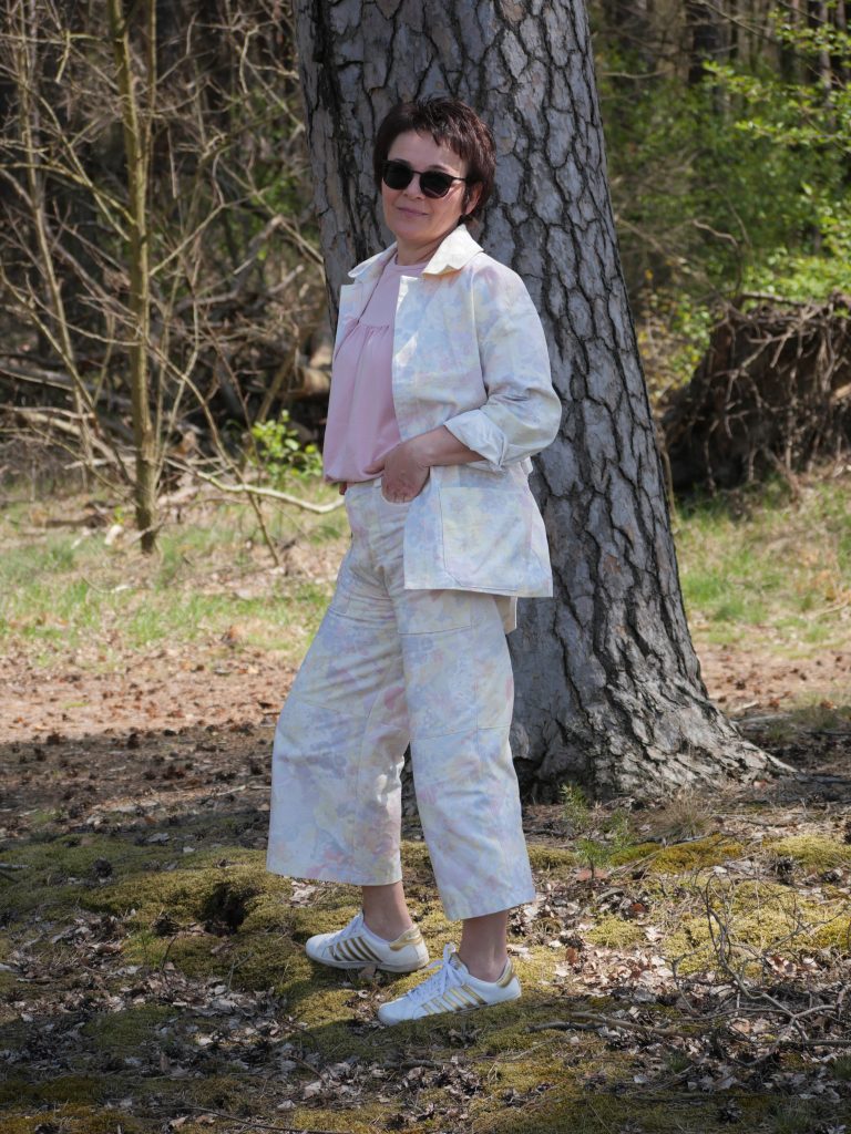 Toll genäht und tolle Schnitte für Hose und Jacke. Die helle Jacke zur dunklen Hose oder die helle Hose zu einem unifarbenen Oberteil kann ich mir super vorstellen. Für mich wäre die helle Farbe als Hose+Jacke nicht das ideale, daher kann ich Deine Bedenken nachvollziehen. Aber vielleicht kommt der Sommertag, wo dieses Outfit aus Hose und Jacke das Einzig Wahre ist.