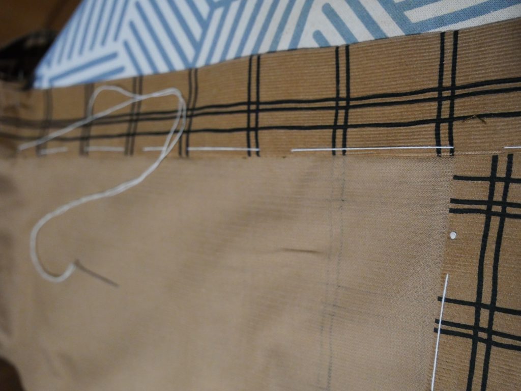 Die bebilderte Anleitung erweckt den Eindruck, dass der vordere Beleg zusammengenäht (also doppelt) anschließend rechts auf rechts an das Vorderteil genäht wird. Zwangsläufig hat man dann die Nahtzugabe sichtbar im Kleid liegen. Im unteren rechten kleinen Bild, dort wo noch die Nadel vom Heftfaden zu sehen ist, wäre die offene Nahtzugabe des Belegteiles. Das kann doch so nicht gewollt sein. Also den Beleg nochmals abgetrennt und nur eine Seite des Beleges (rechts auf rechts) an das Vorderteil angenäht. Vorteilhaft wird die untere Belegnaht (Saumkante) erst im Anschluss genäht. Es ist ansonsten eine ziemliche Fummelei. Die Nahtzugabe des hinteren Belegteiles habe ich umgebügelt und später per Handstichen festgenäht. Auch den Schlitzbeleg vom Rückenteil habe ich wie oben beschrieben genäht. Sämtliche Handstiche wurden gestern Abend auf dem Sofa vollendet. Zuvor hatte ich alles mit Heftfaden gesichert (siehe Bilder). Sofern ich das Annähen der Schlitzbelege falsch erlesen habe, hat mich glücklicherweise der innere Monk zumindest auf den rechten Pfad gelenkt. Was bin ich auf Inas Bericht gespannt.
