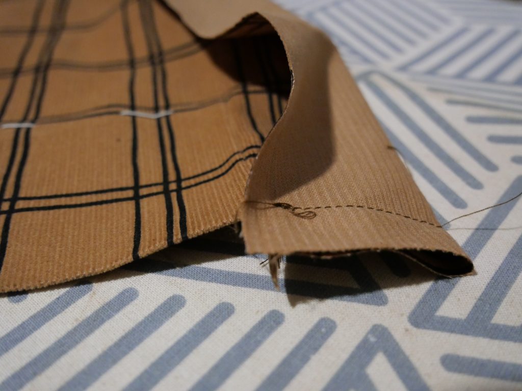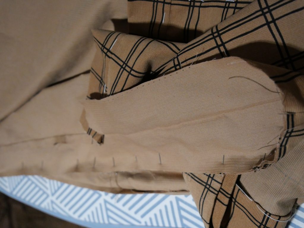 Bei der Schlitzverarbeitung kam ich ins Straucheln. Zuerst hatte ich den vorderen Schlitz(-beleg – Teil 8) ohne „Kleid“-zugabe zugeschnitten. Das konnte also nicht passen. Dann stellt ich fest, dass der Beleg für den hinteren Schlitz (Teil 7) nicht mit den Querstreifen von Vorder- und Rückenteil übereinstimmten. Kurzes Überlegen, in sich gehen und entsprechend beide Belege neu zugeschnitten.