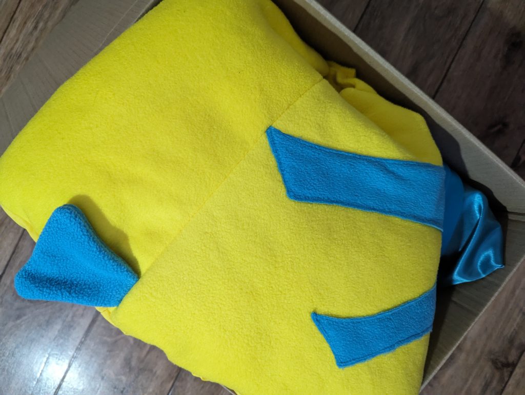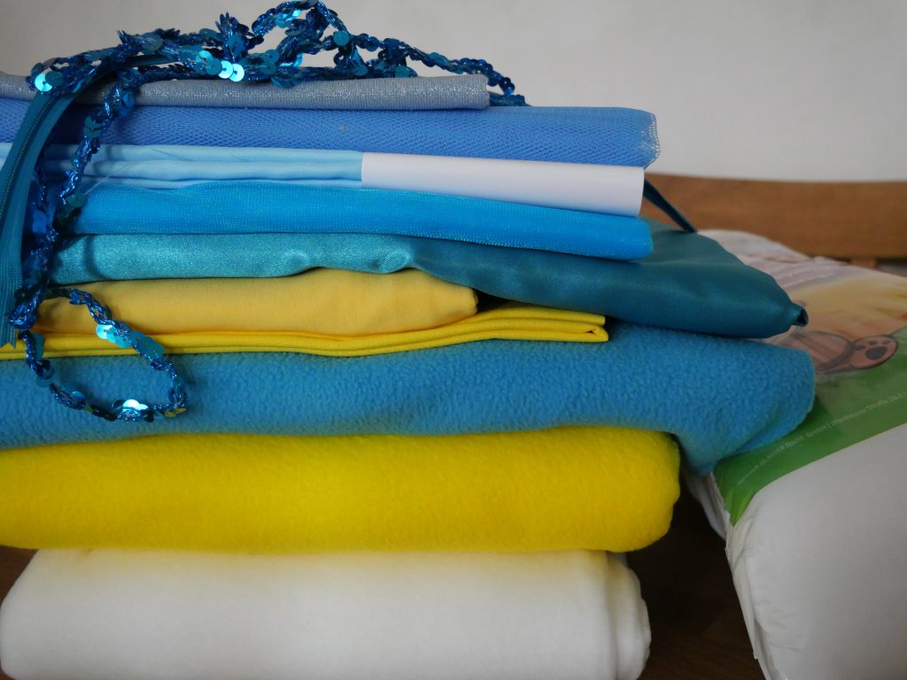 Danach musste ich am Fabius weiter arbeiten. Ich habe die Probeteile (alte Bettwäsche – oben im Bild) als Innenlage an das gesamte Kleid genäht. Dazwischen füllte ich das Kleid mit Füllwatte. Mit einem gelben Futterkleid, welches ich leicht kleiner (vom Umfang ) mit dem Fleece – Kleid verstürzt habe, war nun auch die Innenansicht fein. Mit dem knapperen gelben Futterkleid rollte sich nun auch der Fleece sehr gut nach innen. Passend wurde noch ein gelber Zweiteiler (Ottobre Kidsdesign) aus Jersey genäht. Mit großer Spannung meinerseits wurden die Kostüme nach Frankfurt versandt.