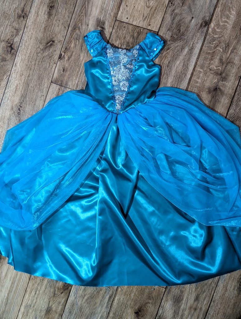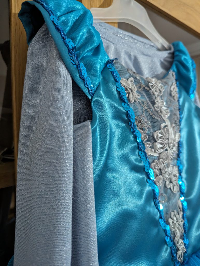 Damit das Kleid auch schön absteht, gab es noch einen Tüllrock. Hierfür habe ich lediglich ein Rechteck aus hellblauem Satin zugeschnitten, im Bund einen Gummi eingezogen und zwei Lagen Tüll in Höhe von 30 cm bei kompletter Tüllbreite geriehen und leicht versetzt (somit in 2 Stufen) übereinander genäht. Die Freude der beiden Enkelmädchen lässt mein Herz hüpfen. Ich bin mir sehr sicher, dass auch diese Kostüme übers Jahr noch ganz oft aus der Kostüme – Kiste geholt werden.