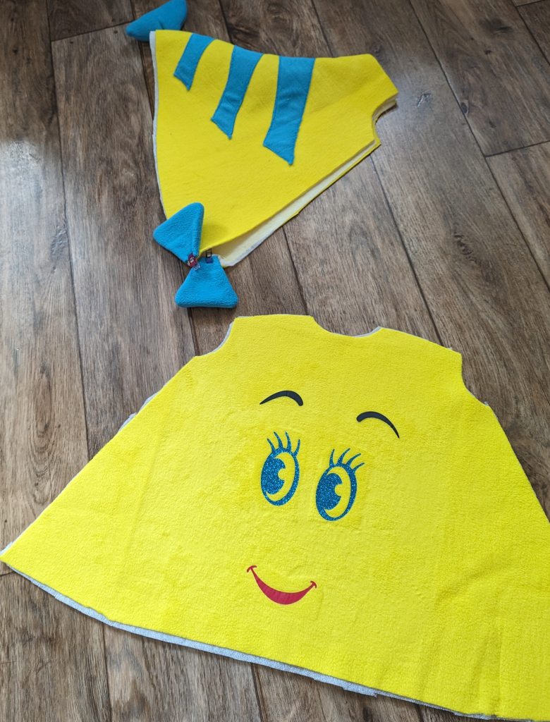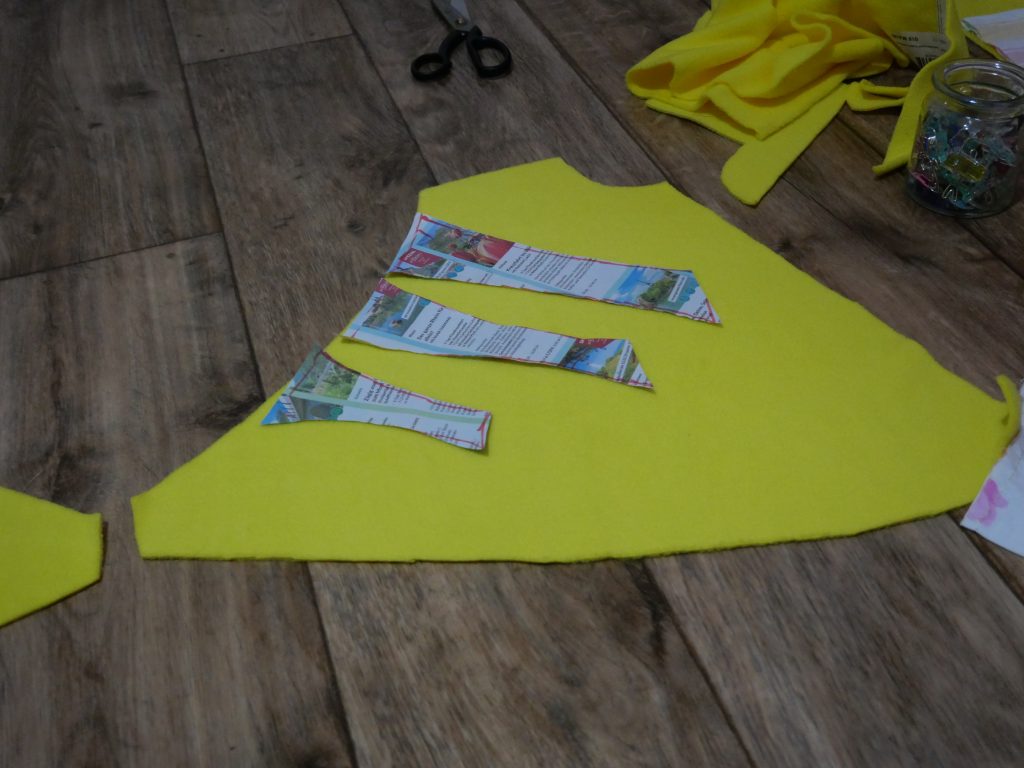 Danach musste ich am Fabius weiter arbeiten. Ich habe die Probeteile (alte Bettwäsche – oben im Bild) als Innenlage an das gesamte Kleid genäht. Dazwischen füllte ich das Kleid mit Füllwatte. Mit einem gelben Futterkleid, welches ich leicht kleiner (vom Umfang ) mit dem Fleece – Kleid verstürzt habe, war nun auch die Innenansicht fein. Mit dem knapperen gelben Futterkleid rollte sich nun auch der Fleece sehr gut nach innen. Passend wurde noch ein gelber Zweiteiler (Ottobre Kidsdesign) aus Jersey genäht. Mit großer Spannung meinerseits wurden die Kostüme nach Frankfurt versandt.