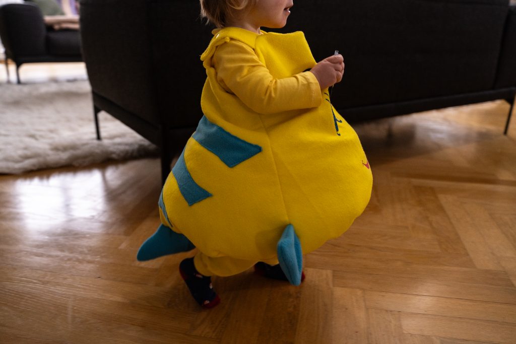 Während littleM und die Eltern allein beim Anblick der Kostüme in Jubel ausbrachen, benötigte miniM eine Nacht Bedenkzeit. Natürlich, so ein riesiges „Kissen“ hat sie noch nie anziehen müssen. Die Mama legte den Fabius ins Kinderzimmer und so konnten erste Berührungen wahrgenommen werden. Als dann die große Schwester am folgenden Tag nochmals ihr Kostüm probieren wollte, war es auch für miniM eine Selbstverständlichkeit. Puuh, nochmal gut gegangen 🙂