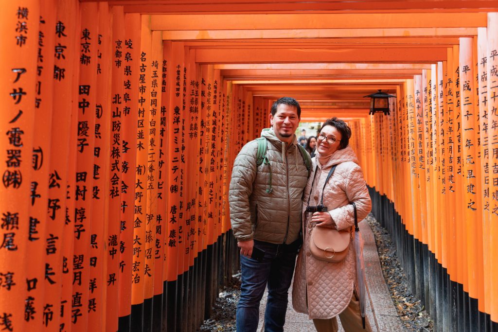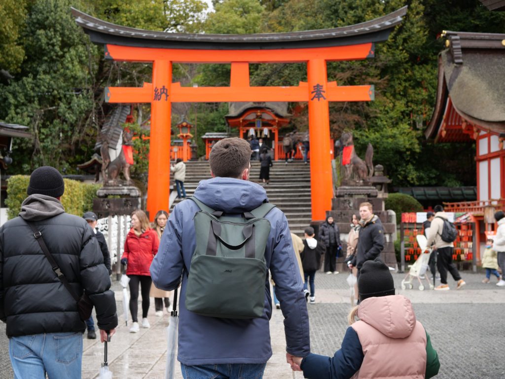 Wenige Minuten später und ausgestattet mit Schirmen vom Hotel starteten wir gemeinsam zum ersten ausgewählten Highlight – dem Fushimi – Inari – Taisha, kurz: Shinto Schrein. Wir wussten natürlich immer vorab, womit der Tag gefüllt ist. Meine Tochter schickte unserer Tokio Gruppe spätestens am Vorabend den jeweiligen Reiseplan und wir wurden auch immer zur allgemeinen Abstimmung aufgefordert.