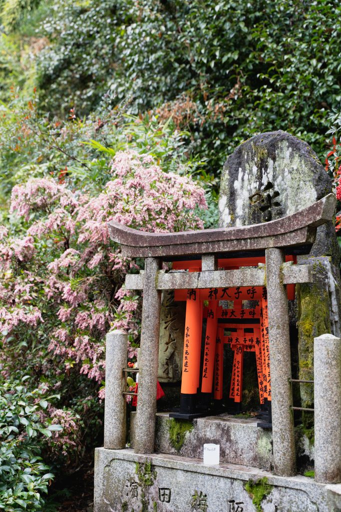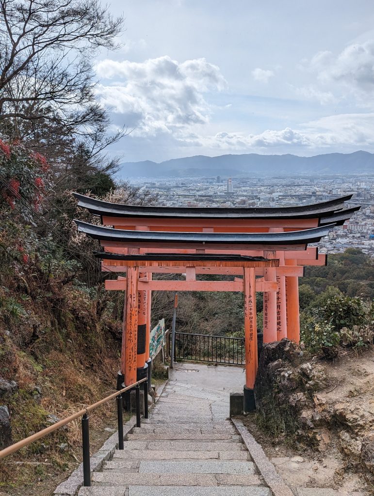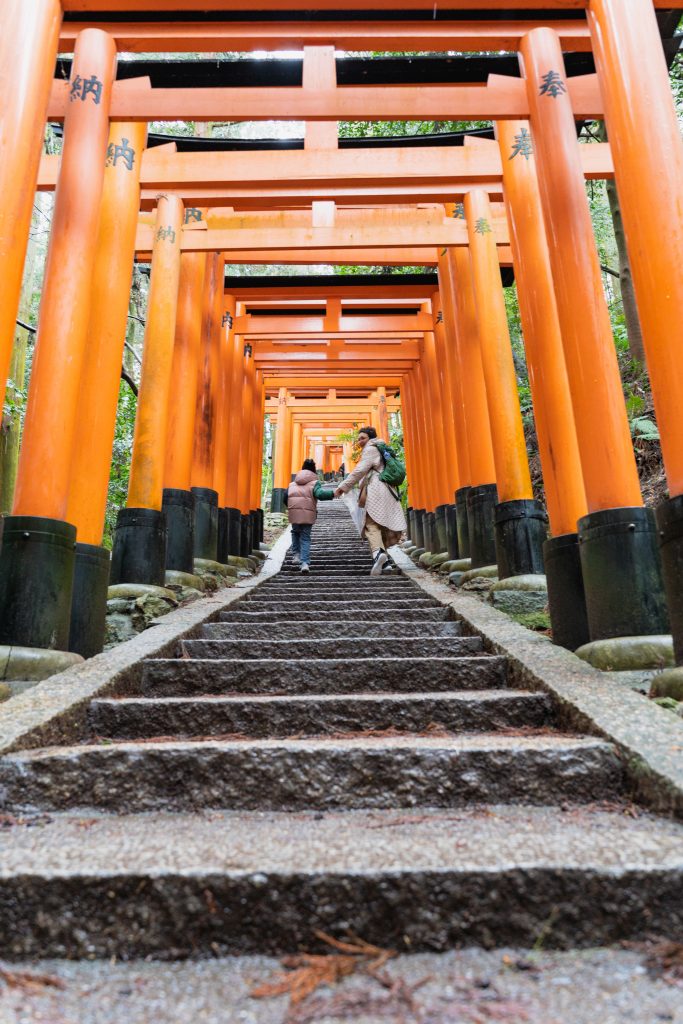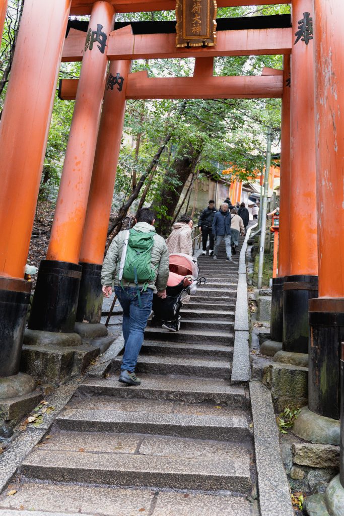 Mit Buggy war der Aufstieg eine Herausforderung. Nach einigen Metern aufwärts entschied sich ein Teil der Gruppe für die Umkehr. LittleM, Johannes und ich wollten unbedingt bis nach oben. Der Weg führte vorbei an weiteren kleinen Schreinen und immer wieder durch rot-orangene Schreinentore. Der Ausblick von oben und auch das Durchwandern dieser faszinierenden Schreintore bleibt unvergessen.