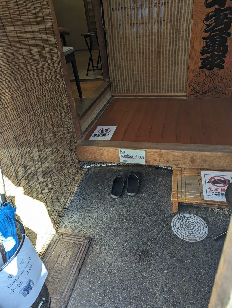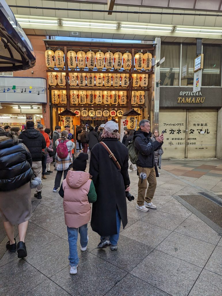 Hin und Rückfahrt erfolgten mit der Bahn, alles ganz easy und zuverlässig. Nach einem kleinem Cafe – Stopp in Gion – Shijo in Verbindung der zu erledigenden Schulaufgaben, schlenderten wir anschließend durch die Shijō Street mit den außerdem wundervollen quer verlaufenden Seitenstraßen mit unzähligen Geschäften. Was für eine Auswahl an kleinen wunderschönen Lädchen, was für handgemachte Köstlichkeiten und was für eine tolle Atmosphäre insgesamt. Fürs Abendessen teilten wir uns zum ersten Mal auf. Mit 7 Personen Platz zu finden, ist fast unmöglich. Spazierend zum Hotel zurück und nach kurzen Saunagängen einiger Reiseteilnehmer fielen wir müde, aber glücklich ins Bett. Diesen Genuss kosteten wir ungeplant viel zu lange aus. Angesagt war unser Treffen um 8 Uhr zum Frühstück im Hotel. Kurz vor 9 klopfte es an unsere Tür. Gemeinsam hatten wir alle 7 verschlafen.