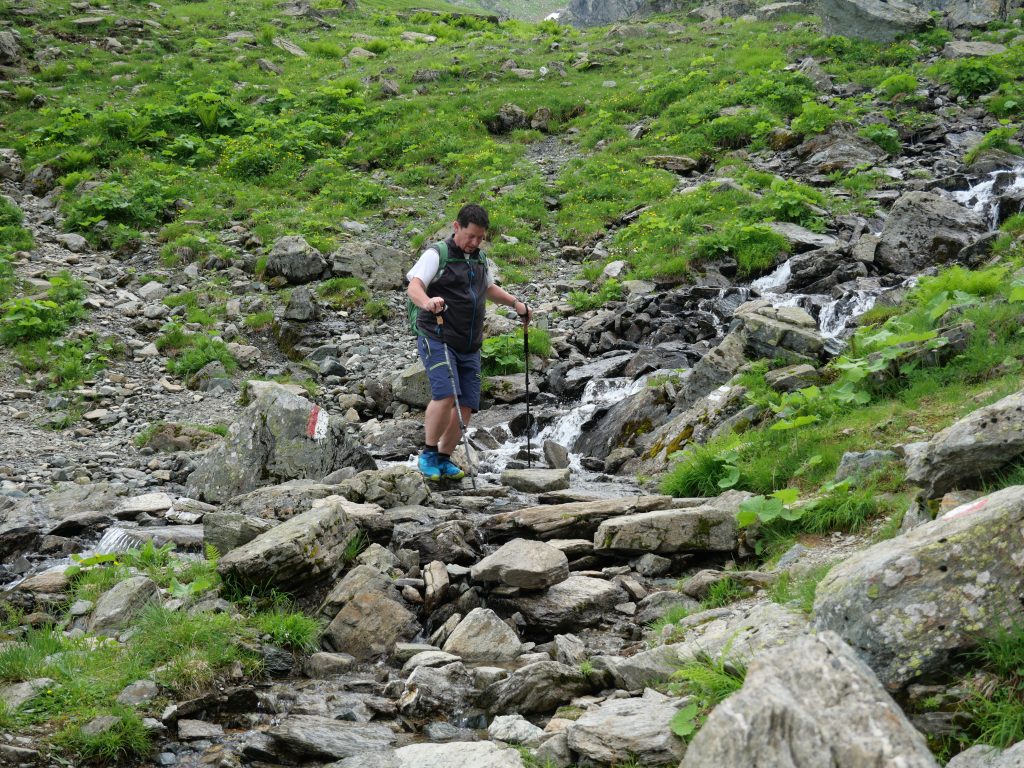Der Abstieg ist vermutlich nicht weniger schwierig, als über die Gesteinsbrocken beim Aufstieg. Der steinige Weg wird immer wieder von Wasserläufen überspült, weshalb es ziemlich rutschig ist. Auf Schneefelder müssen wir verzichten und vermutlich erscheint uns daher der viel Weg länger.