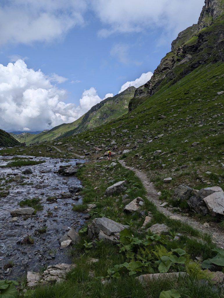 Wir nehmen uns kurz Zeit für einen Powerriegel und genießen unser Wasser. Wie weiter, dass ist die große Frage. Wir schieben diese Entscheidung bis zur Weggabelung auf und gehen dann erneut auf „alten Pfaden“ in Richtung Alpe Nova. Es gilt keine Zeit zu verlieren, denn die letzte Gondel fährt 17 Uhr. Uns bleiben noch etwas mehr als 3 Stunden bis zur Bergstation. Über lange Strecken sind wir allein unterwegs. Insgesamt kommen uns nur 6 Gleichgesinnte entgegen. Viel später werden wir von einem Heranwachsenden überholt. In einer unglaublichen Schnelligkeit vergrößert er den Abstand zu uns und wir werden ihn bis zum Schluss nicht wiedersehen.